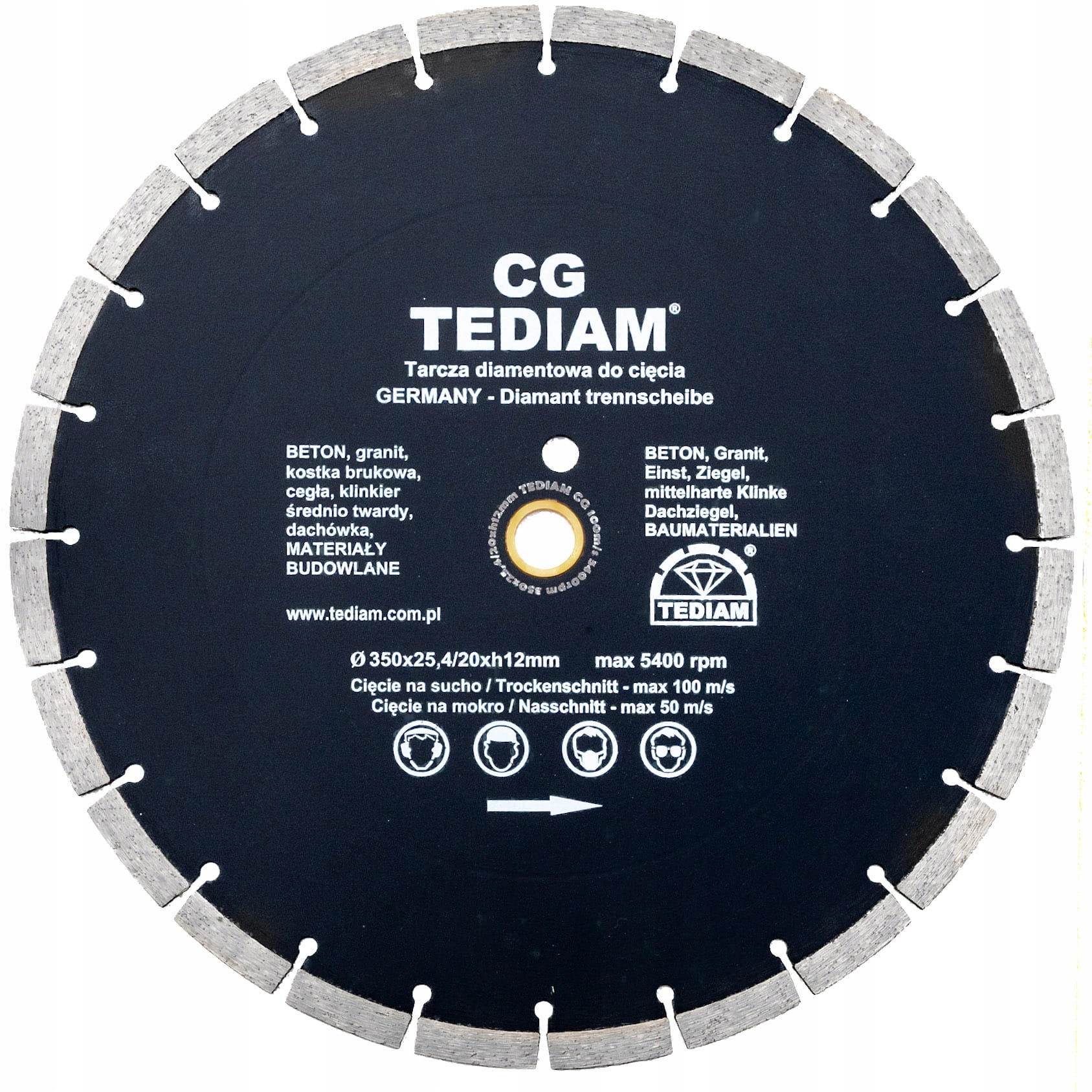 Tarcza diamentowa z wieńcem segmentowym renomowanej marki TEDIAM model CG to produkt wykonany w nowej technologii produkcji, przeznaczony do wysokiej jakości cięcia betonu, kostki brukowej, gazobetonu, granitu, marmuru, cegły, płyt cementowych, klinkieru, dachówki, betonu komórkowego i innych.