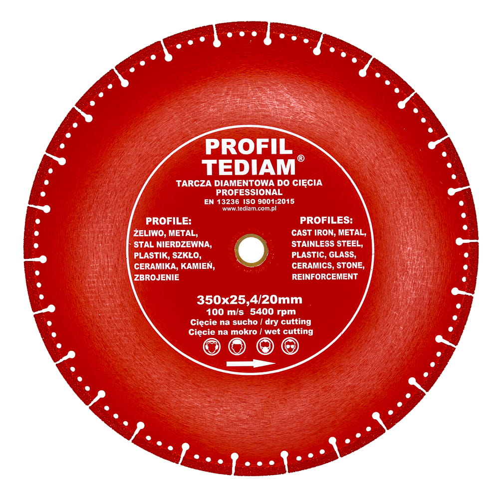 Tarcza o mocy 100 m/s marki Tediam jest odpowiednia do pracy na mocnych pilarkach spalinowych takich jak jak Stihl (20 mm) oraz innych z otworem calowym (25,4 mm).