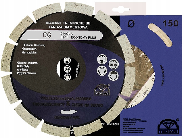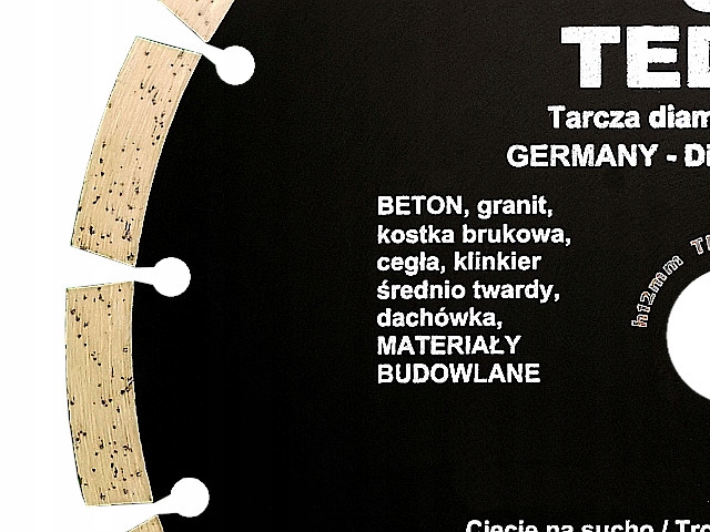 Tarcza diamentowa z wieńcem segmentowym renomowanej marki TEDIAM model CG to produkt wykonany w nowej technologii produkcji, przeznaczony do wysokiej jakości cięcia betonu, kostki brukowej, gazobetonu, granitu, marmuru, cegły, płyt cementowych, klinkieru, dachówki, betonu komórkowego i innych.