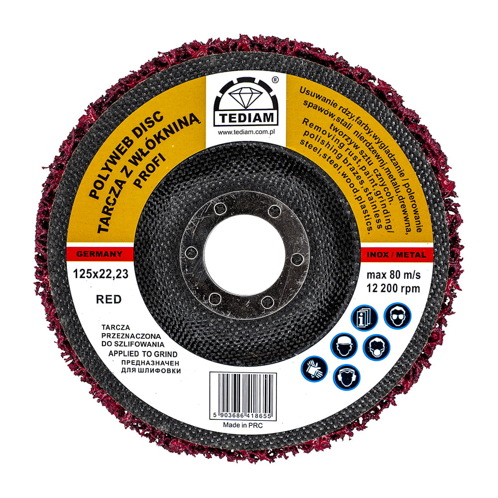 Ściernica marki TEDIAM wykonana jest z grubej i gęstej włókniny wysokiej jakości. Uniwersalna tarcza przeznaczona jest do mechanicznego usuwania, polerowania, wygładzania i ścierania m.in. metalu, stali kwasoodporna inox, drewna, tworzyw sztucznych i innych.